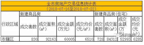 7月24日,据阜阳市房地产管理局最新发布信息,公布了7月16日-7月22日(7月第三周)阜阳市房地产市场的交易状况,阜阳市辖区商品房销售共830套,销售总面积为92163㎡,销售均价为6510元/㎡,总销售金额约为60005万元;